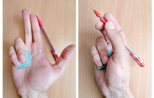 - С использованием резинки. Можно взять простую резинку, разместить ее на запястье ребенка и на самой ручке. В таком случае она займет необходимую позицию для письма и малышу будет понятнее, как это делать.