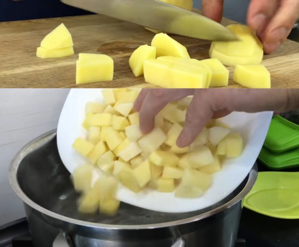 - Очистите картошку, нарежьте её кубиками и отправьте в кипящую воду. Проварите 15 минут.