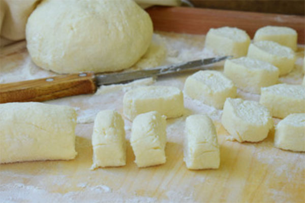 - Вымешивают, получившуюся массу разделяют на части, которые превращают в колбаски, нарезают на маленькие кусочки.