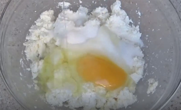 - Творог перетирают с яйцом, сахаром.