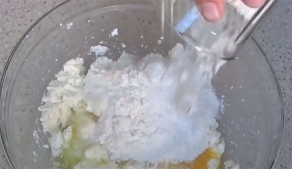 - Творог смешиваем с мукой, подсаливаем.