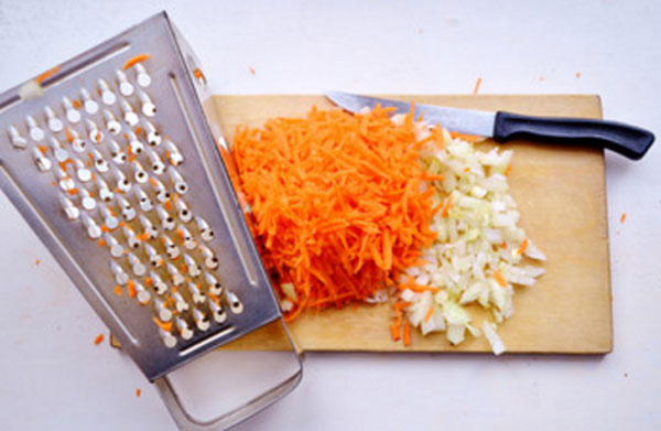 - Лук, морковку очищают, натирают на терке или измельчают в блендере.